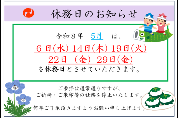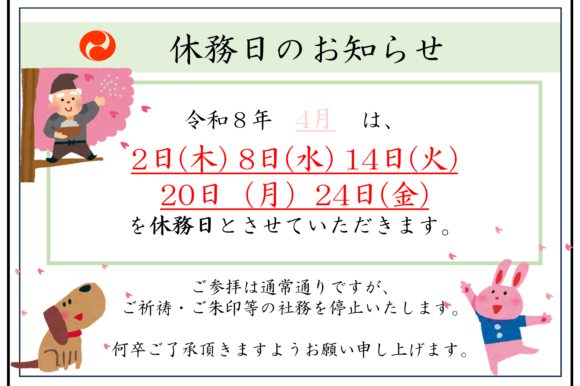 令和8年3月は 4日(火)9日(月)16日(月)23日(月)27日(金) を休務日とさせていただきま…