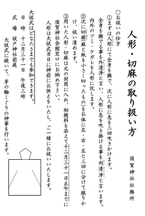 ※当日参加できない方には、事前に大祓の人形と切麻を須賀神社会館にてお配りしております。各々でお祓い頂いた上で人形を12月31日の「正午まで」に須賀神社会館へお持ちください。
